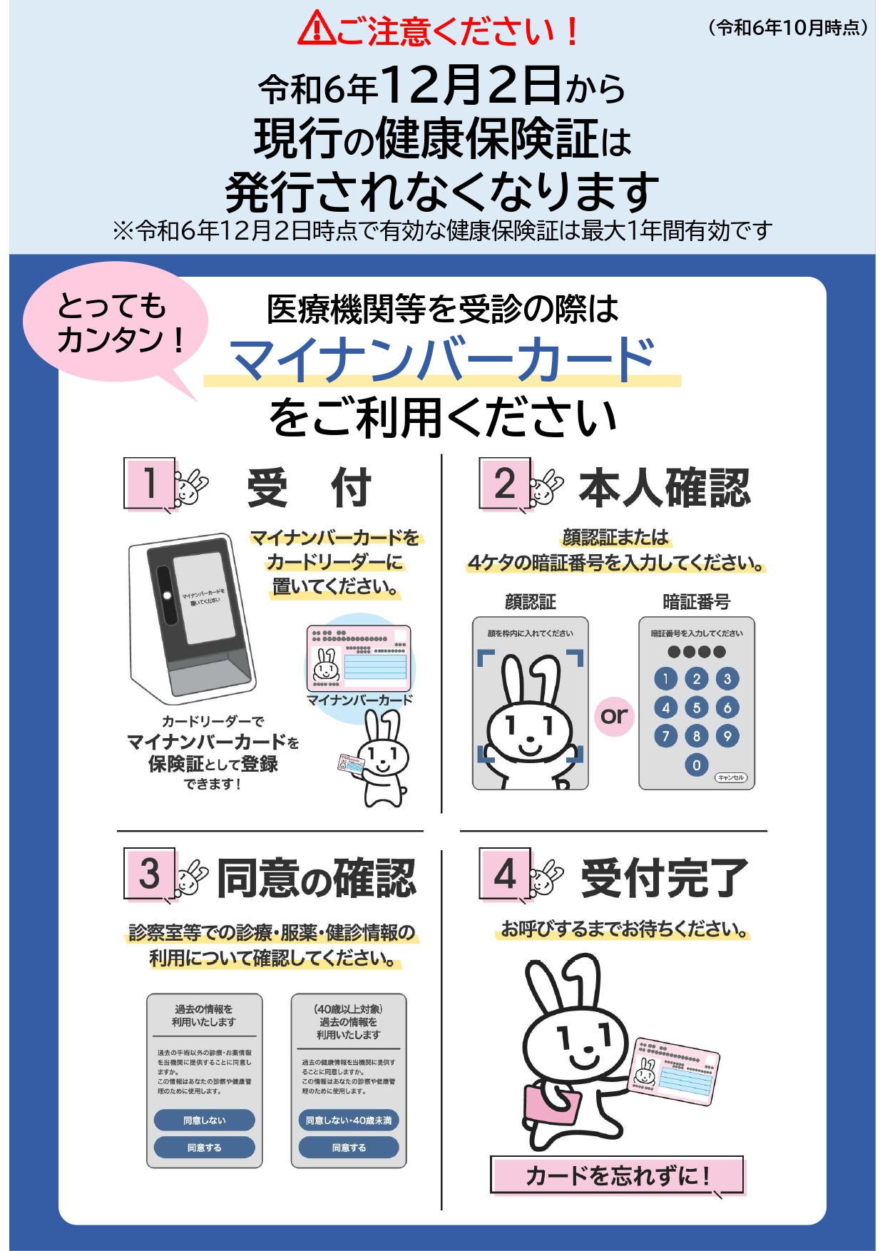 新規の健康保険証は発行されませんので、医療機関の受診は「マイナ保険証」を利用していただくよう周知が必要です。