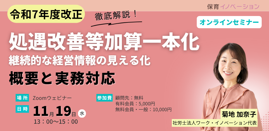 本弊所代表の菊地加奈子の著書「保育園の労務管理と処遇改善等加算・キャリアパスの実務(4訂版) 2025年5月21日発売」の中で解説している内容に加えて、全国各地の法人様のリアルなお悩みをお伺いしながら数多くの賃金制度・キャリアパス作成のご支援をさせて頂いている弊所の事例をもとに、実践編の学びができるセミナーです。
