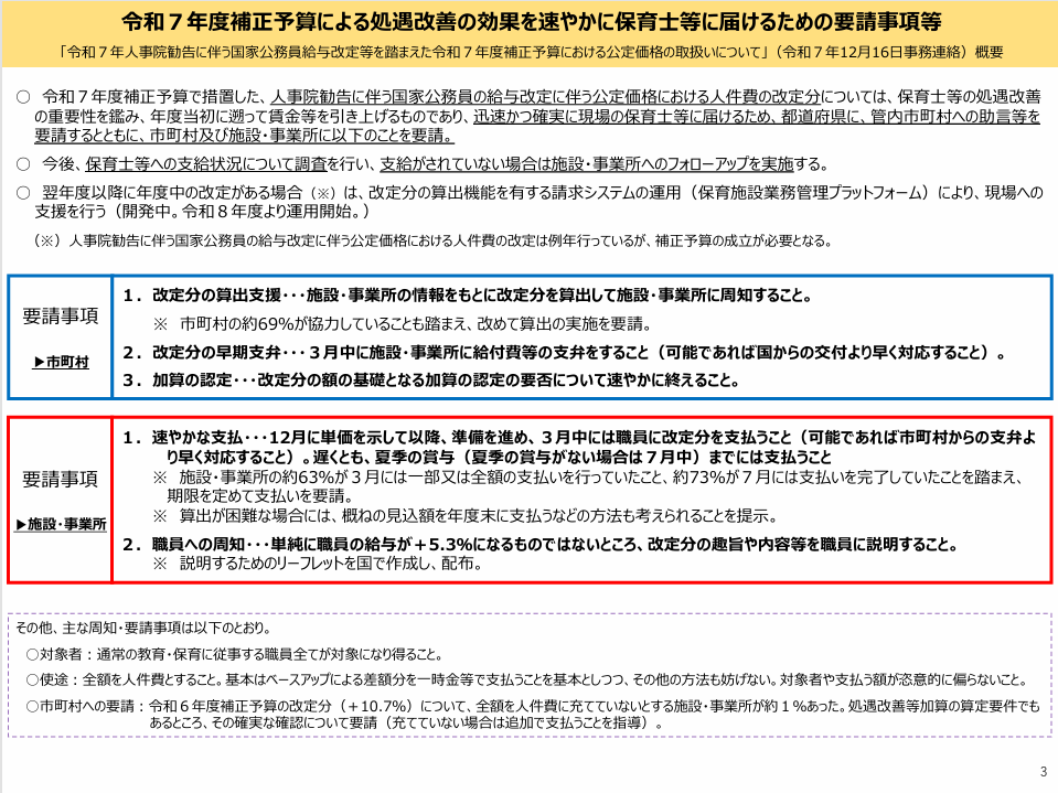 これについて、3ページ目の「令和7年度補正予算による処遇改善の効果を速やかに保育士等に届けるための要請事項等」では主に以下の内容が説明されています。